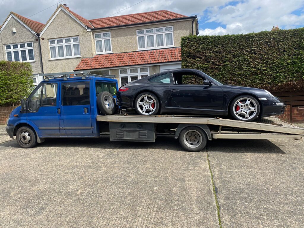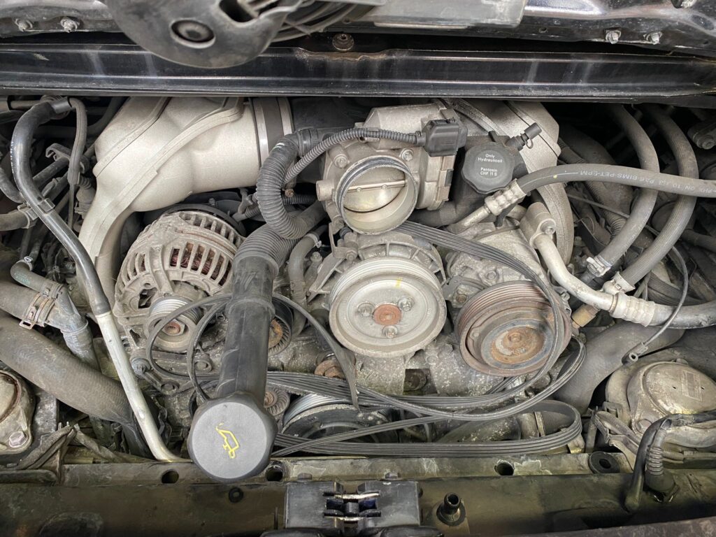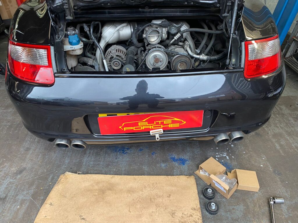 Porsche 997 S recovered by us using our vehicle recovery service after it was inoperable. After diagnosis back at our Belvedere garage we discovered that the drive belt had shredded after the idler pulley had exploded.